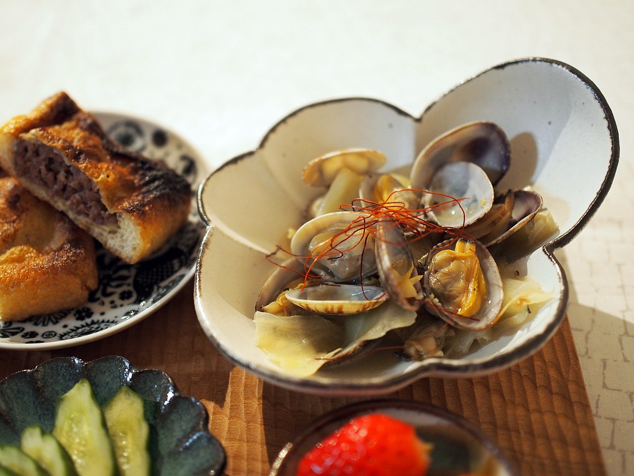 アサリと春キャベツの酒蒸しは前日の残り物。