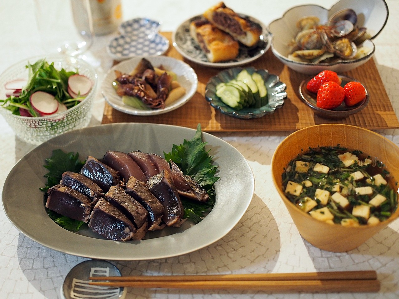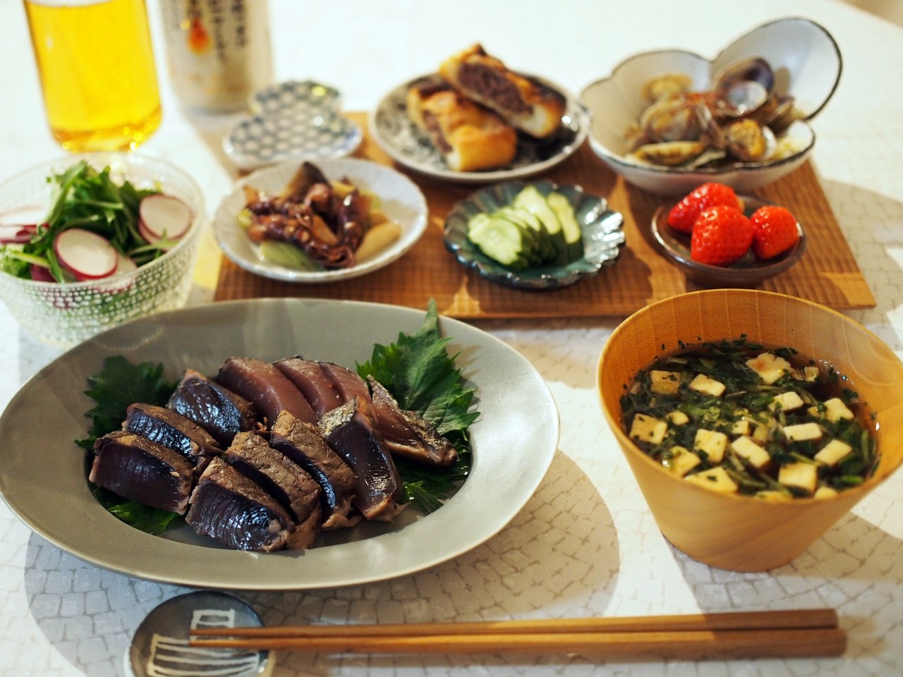 井山さんの器には買ってきた鰹のタタキを。