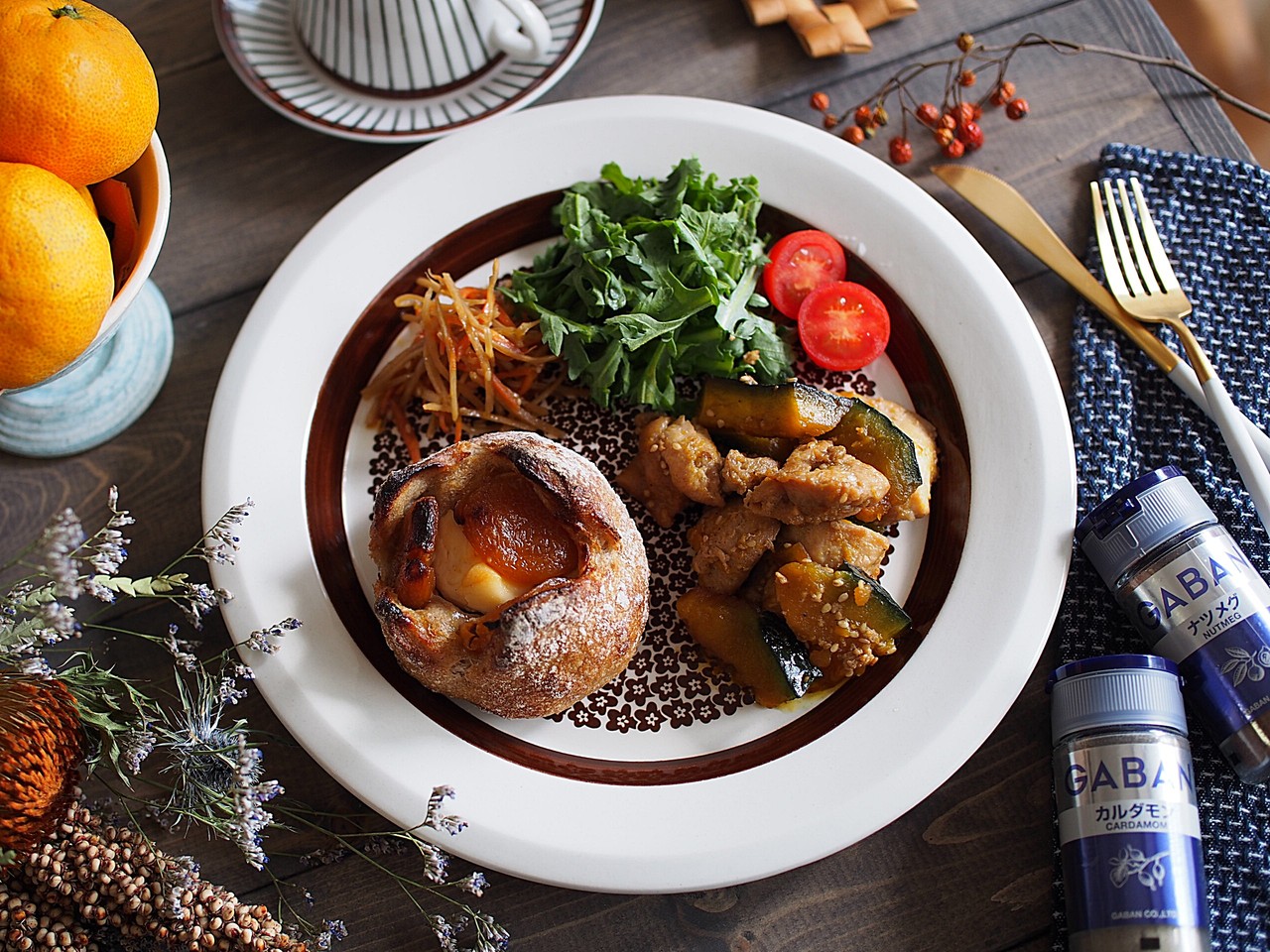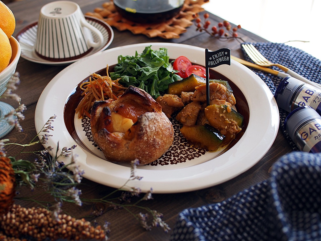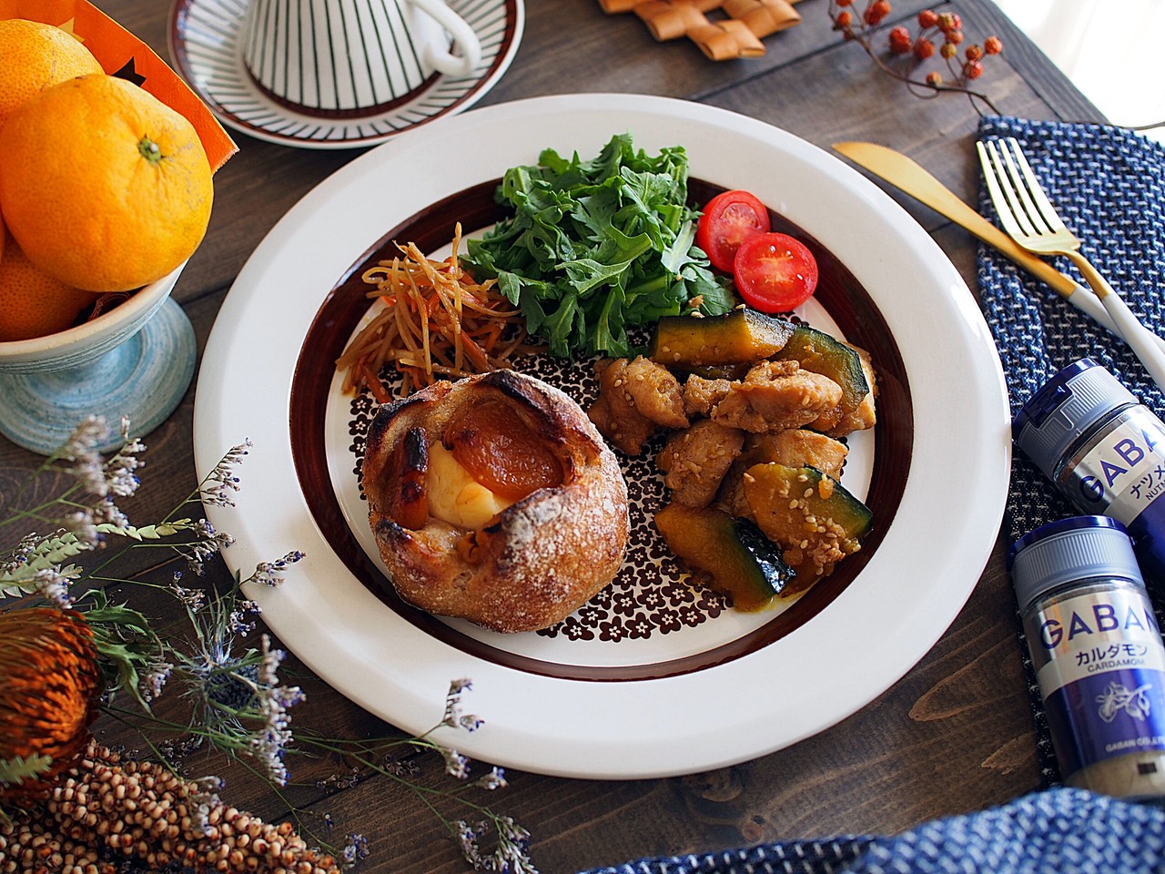 鶏むね肉とかぼちゃの照り焼きに美味しいパン屋さんのパン 笑