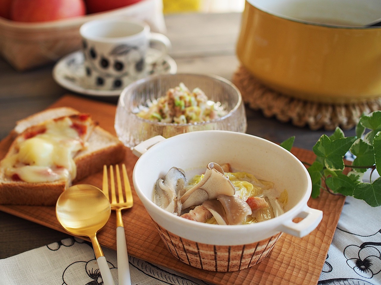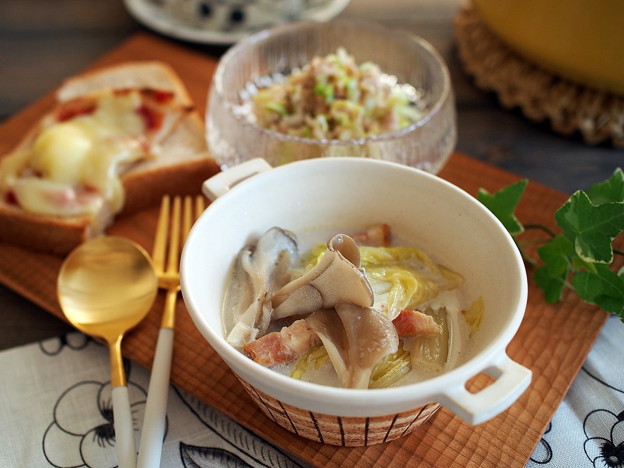 白菜や舞茸を使って簡単ミルクスープなどでおうちごはん。