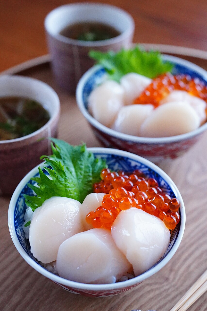 ホタテといくらをごはんの上に