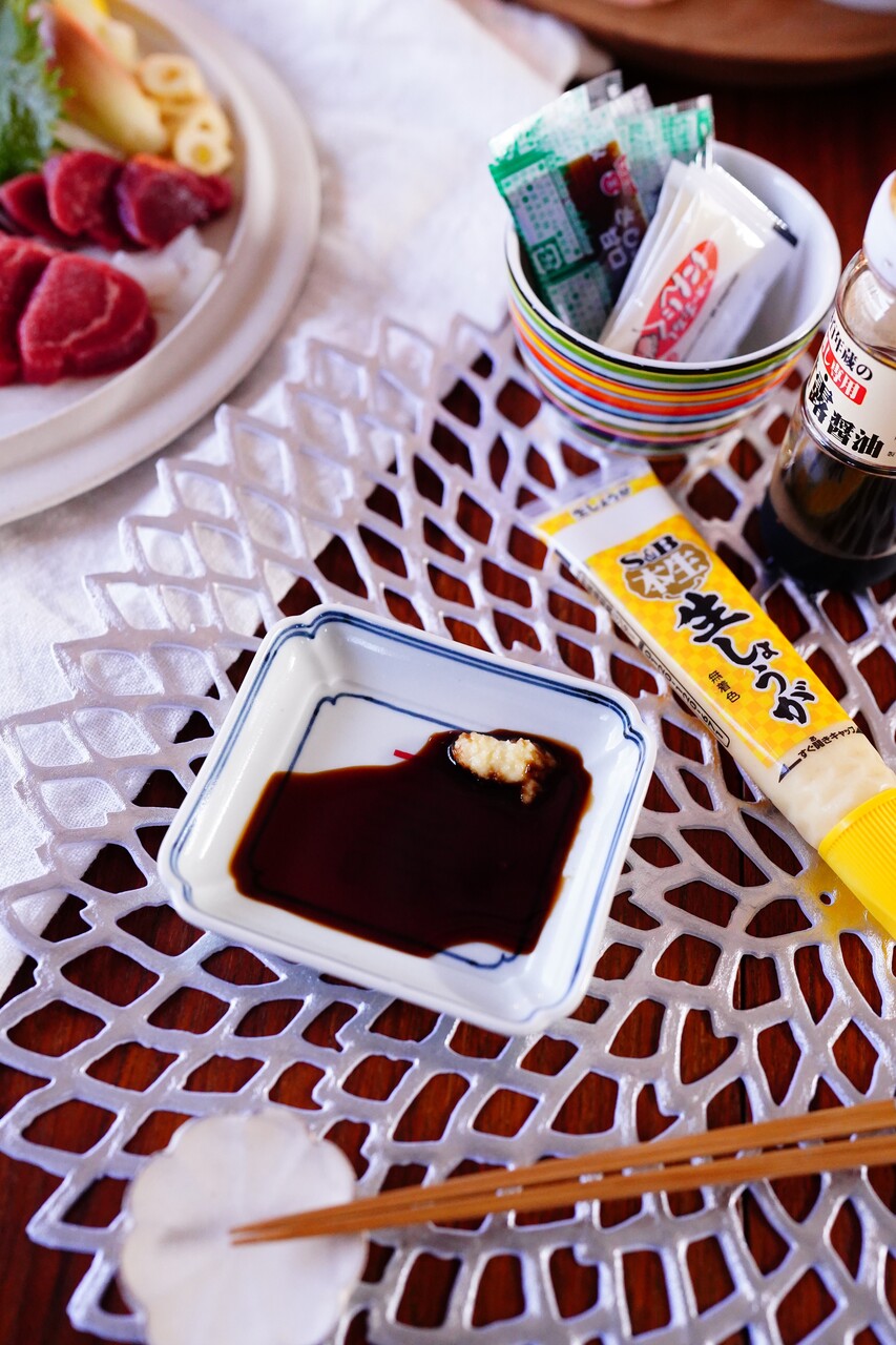 馬刺しには九州の甘めの醤油が必要不可欠( *´艸`)